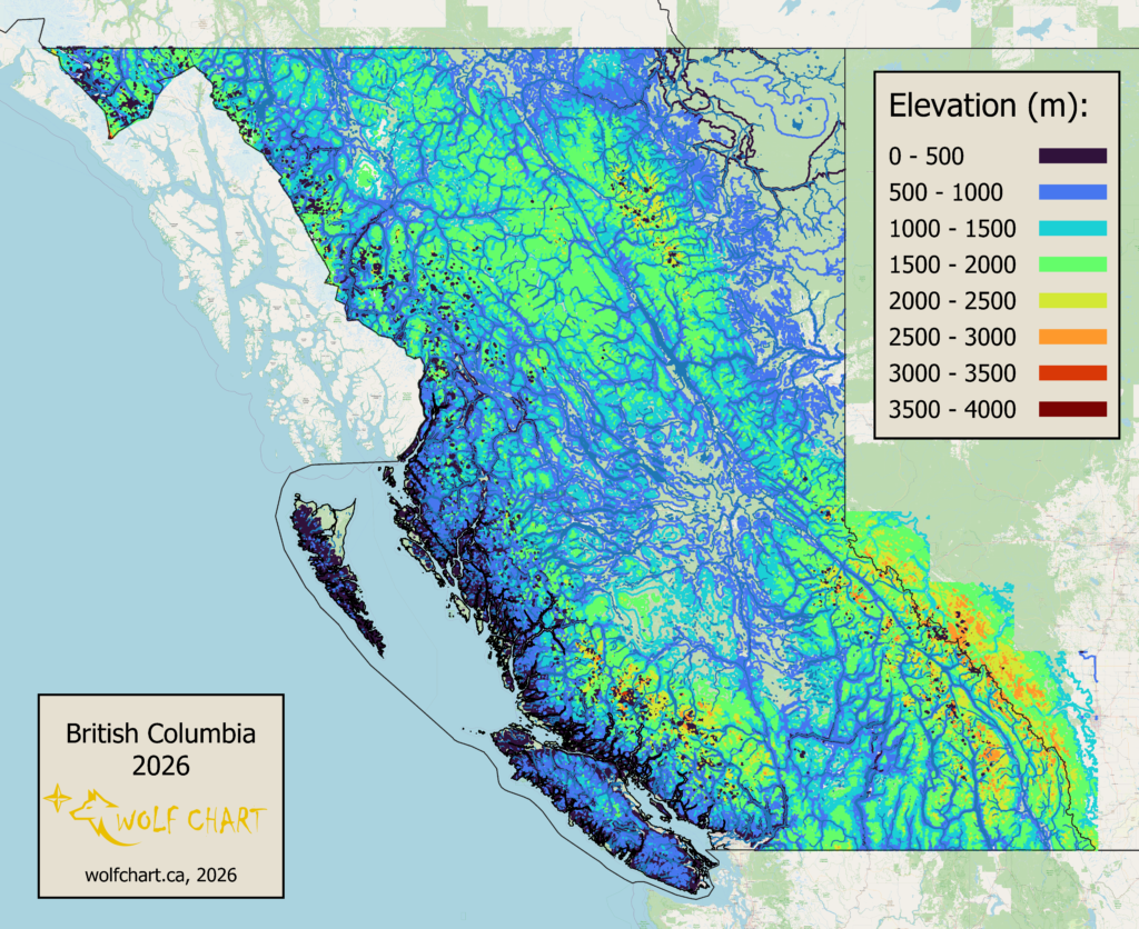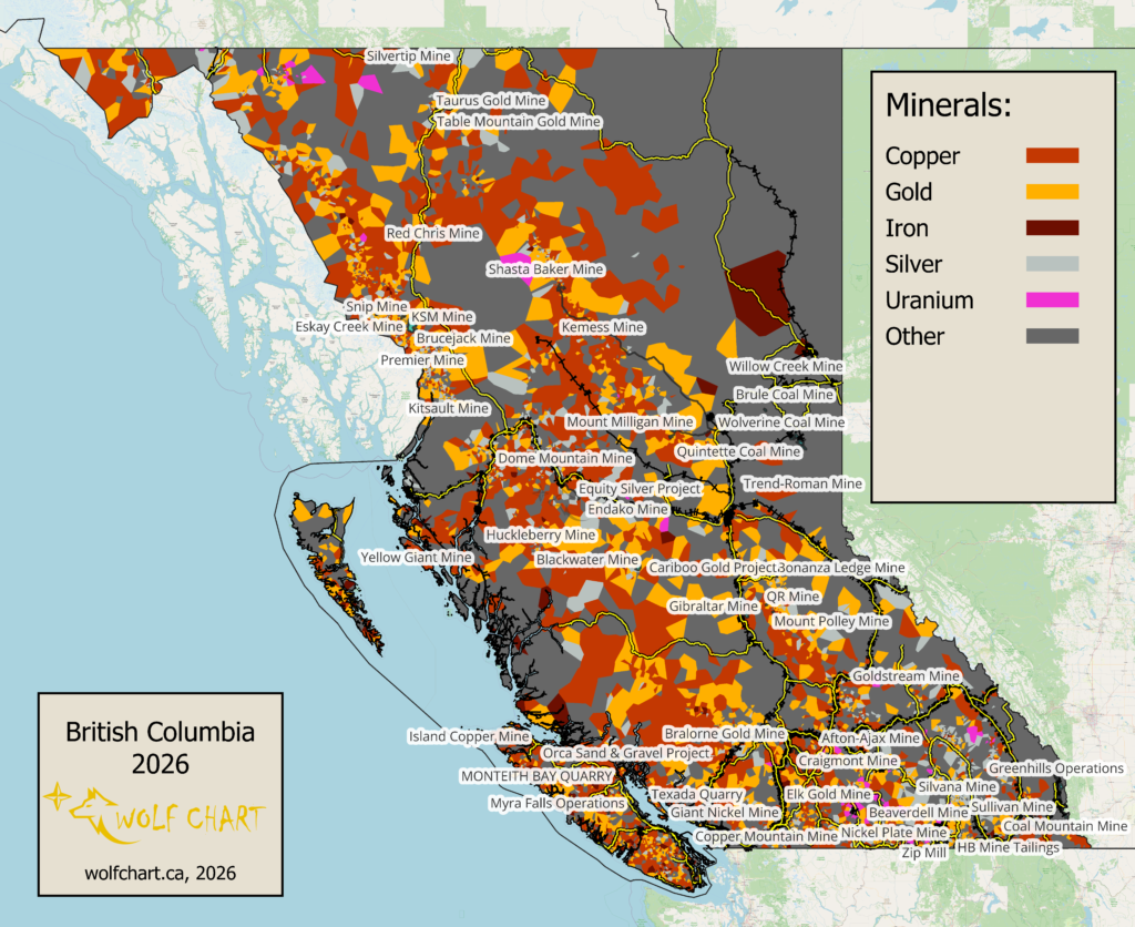 This map depicts the distribution of five critical strategic minerals. It would appear that at least half of BC is covered with copper and gold. It is important to understand that the MINFL mineral occurrence dataset is based on reported deposits, so prospectors would be actively looking for strategic minerals like copper and gold to begin with, hence the bias. Also, each MINFL point can contain record multiple minerals at each site, and this map displays the primary mineral in the deposit.